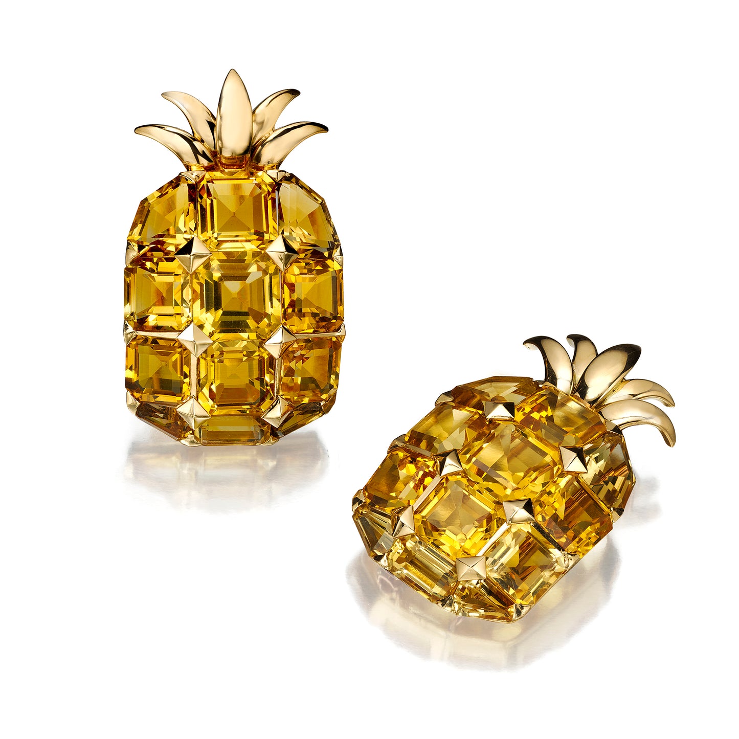 A pair of dress clips designed as stylized pineapples set with step-cut citrines held in place by polished gold pyramid-capped prongs and crowned by polished gold sprigs; mounted in 18-karat yellow gold