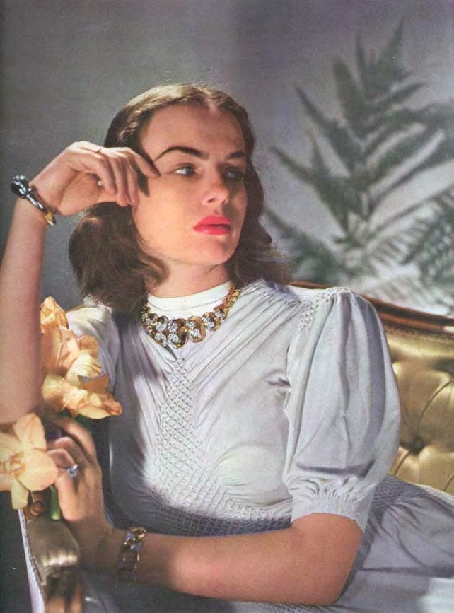 The 1940s was largely dominated by World War II, and the pressures of wartime changed material culture and leisure pastimes. Women went to work in large numbers to fill positions vacated by soldiers, and their clothing changed from carefree flapper attire to a professional silhouette dominated by suit jackets with wide shoulders and nipped in waists. Going to the movies became a major pastime, and the advent of Film Noir, with dark themes and chiaroscuro lighting, reflected the serious attitudes of the era. The exaggerated visuals in film and fashion required bold oversized jewels.