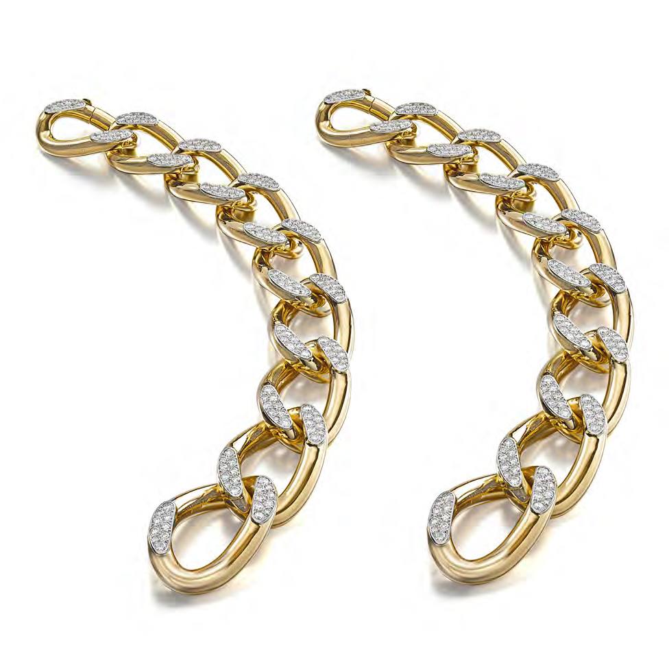 In 1940, Vogue featured a picture of Princess Hohenlohe, an American who married a Polish diplomat. She was photographed by Horst in an atmospheric Film Noir manner with a serious expression and heavy shadows. The Princess wears bold gold and diamond jewelry, including a Cartier bracelet identical to the ones in this set, which complements the serious feel and adds subtle glamour. Twisted links of gold come together to make this jewel. The place where the links meet is subtly flattened and set with diamonds in platinum, adding a touch of chic luxury. Hidden clasps allow the necklace to be separated into various combinations of necklaces and up to four bracelets that can be stacked or worn individually.