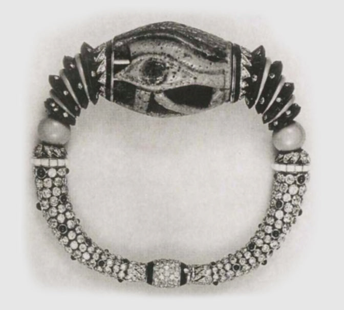 Egyptian culture has influenced artists and designers since Napoleon first excavated in Egypt in 1789. But the style did not come to full fruition until Howard Carter discovered King Tutankhamen’s tomb in 1922. Cartier created jewelry inspired by objects from the excavation, and sometimes, as in this bracelet, combined ancient artifacts in modern settings.