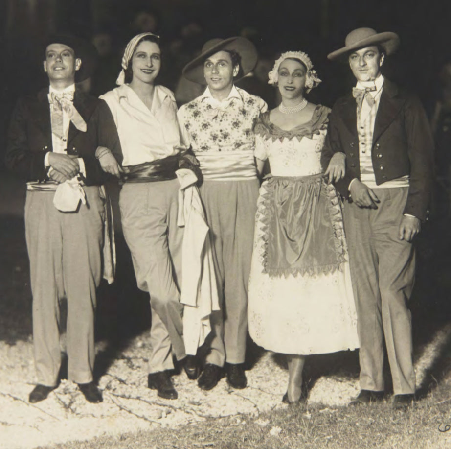 A photo from a costume ball featuring Cole Porter (left), Fuclo di Verdura (center), and Linda Lee Porter (second from right). Photo from the album of Princess Natalie Paley now at the Beinecke Rare Book and Manuscript Library, Yale University. Linda Lee Porter gifted this Cartier set to Natalie Paley.
