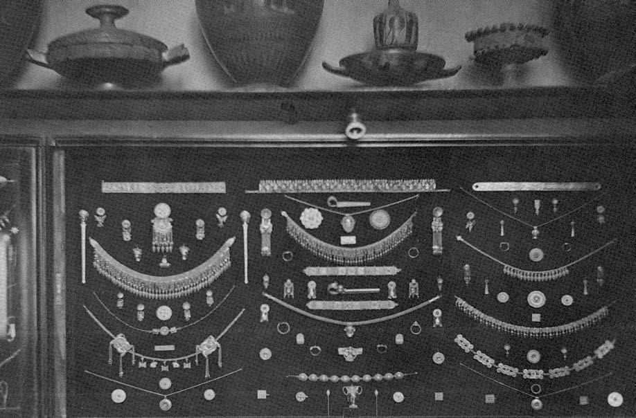 The stylish interior of Castellani’s shop at the Piazza Fontana di Trevi 86 in Rome, displaying their modern jewelry inspired by archeological finds alongside antique vases, c. 1881.