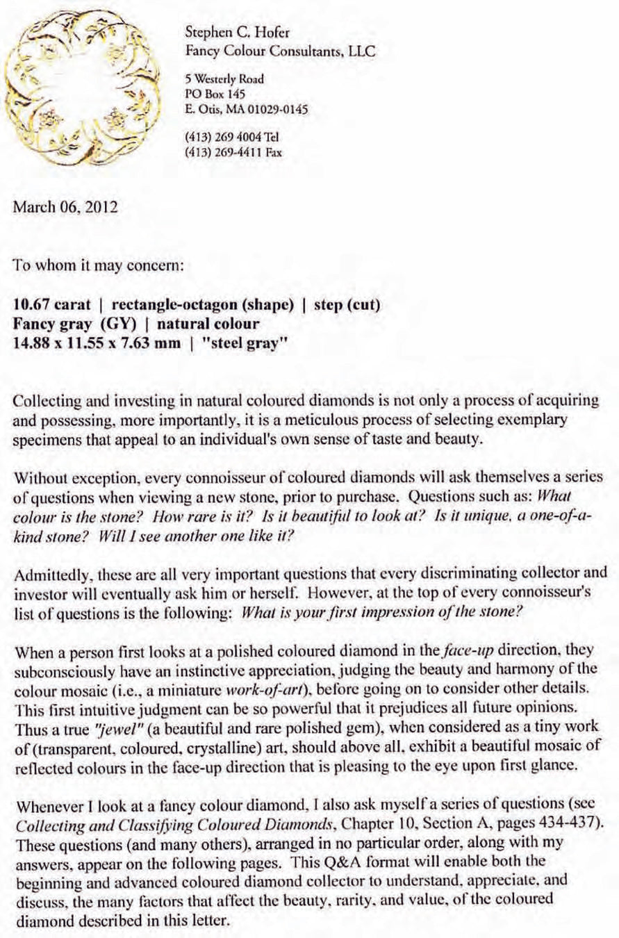 - A Letter Concerning an Important Diamond from Stephen C. Hofer of Fancy Colour Consultants, dated March 6, 2012, stating “The size, clear transparency, pure gray color, and the beautiful blend of gray color tones seen in the face-up direction—combined with the charm, and style, and character of an emerald cut that was most likely polished in the 1920s—makes this particular Fancy gray stone stand out from all the other Fancy gray diamonds. This is a magnificent, large, and important gem quality Fancy gray diamond.”