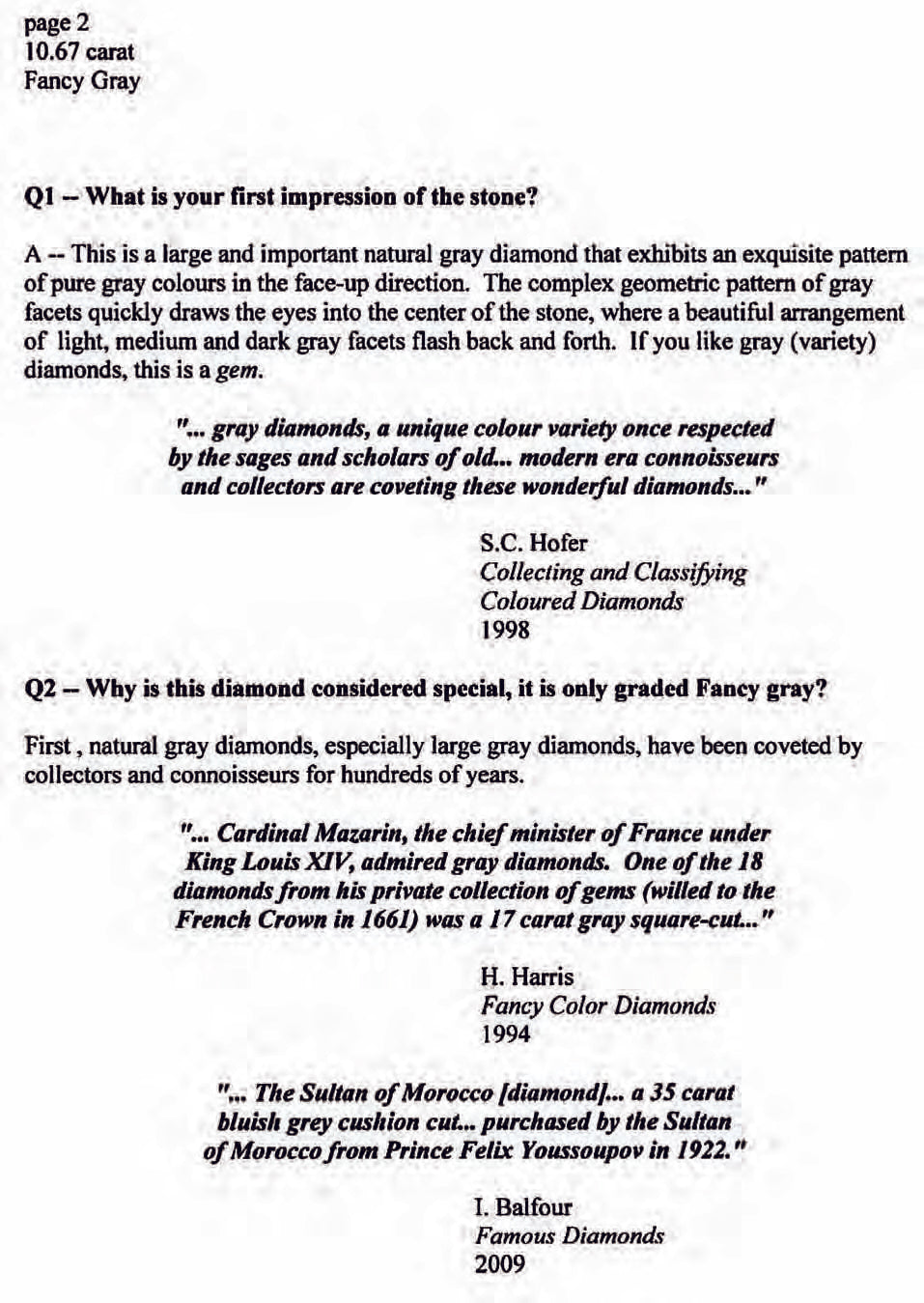 - Gübelin Gem Lab Appendix to Diamond Report no. 11110137 stating “Large diamonds over 10 carats exhibiting such a pure ‘steel gray’ color are rarely encountered in the trade.”