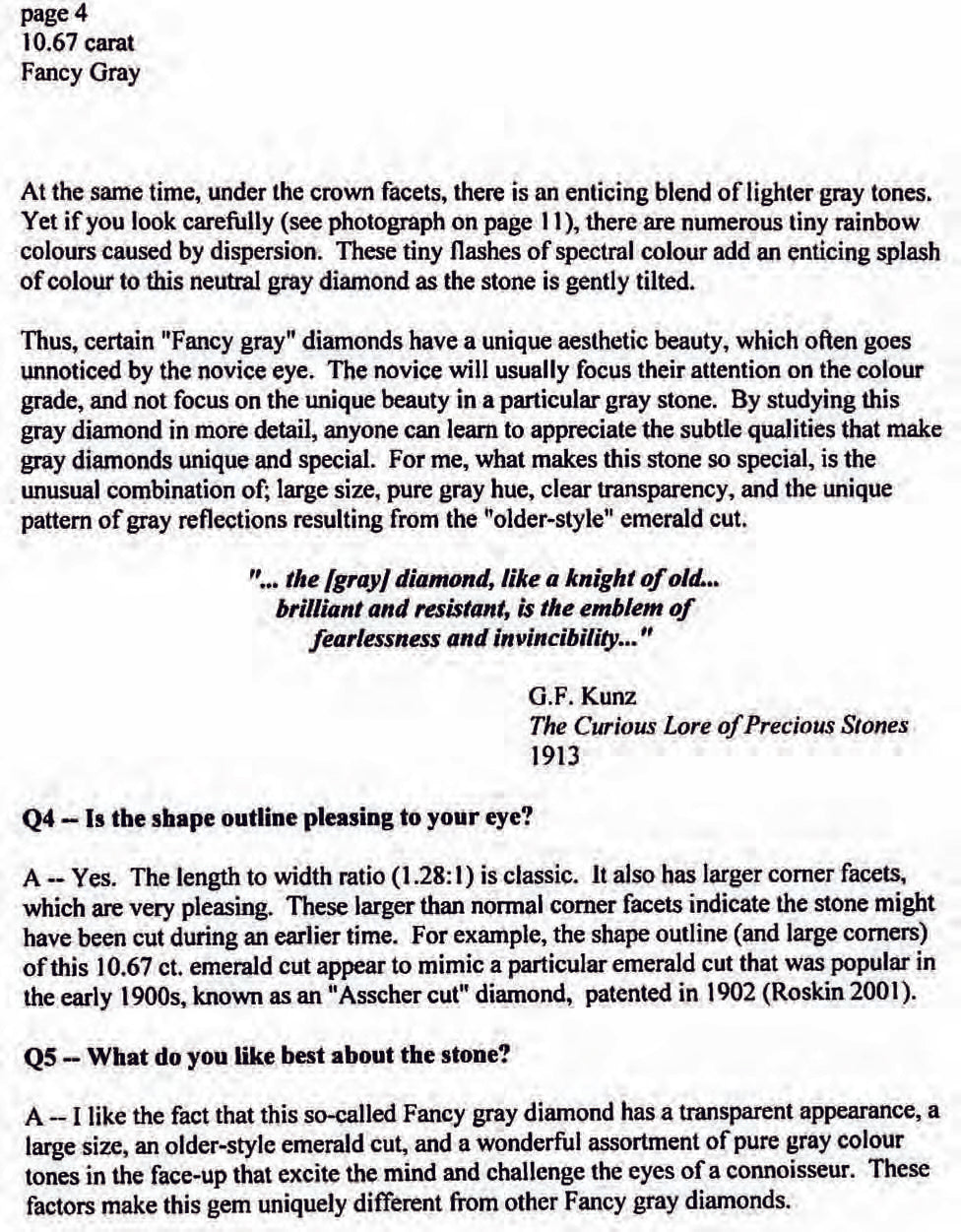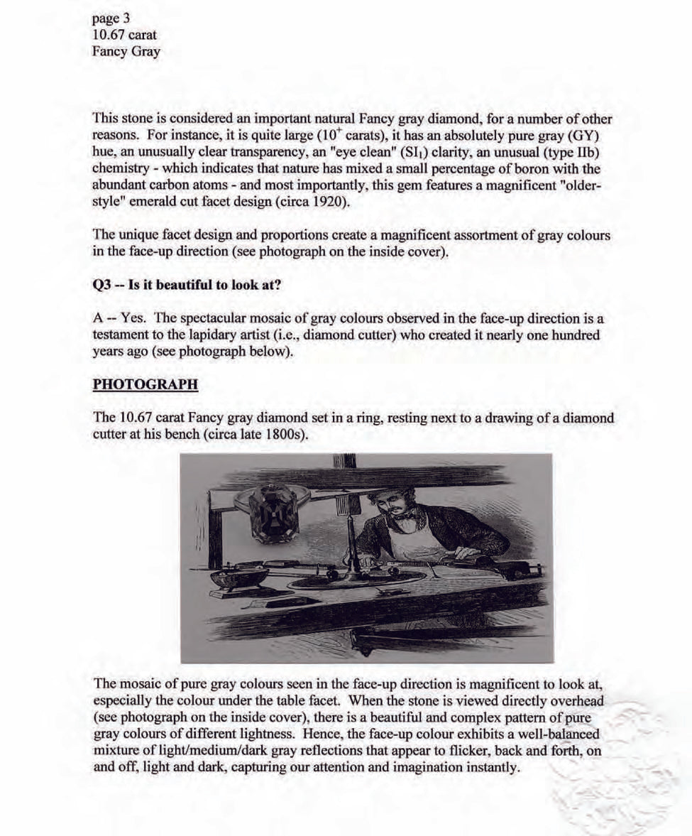 - Gemological Institute of America Diamond Grading Report no. 2135796072, dated August 31, 2001, stating that the 10.67-carat emerald-cut is fancy gray in color with even distribution and SI1 clarity.
